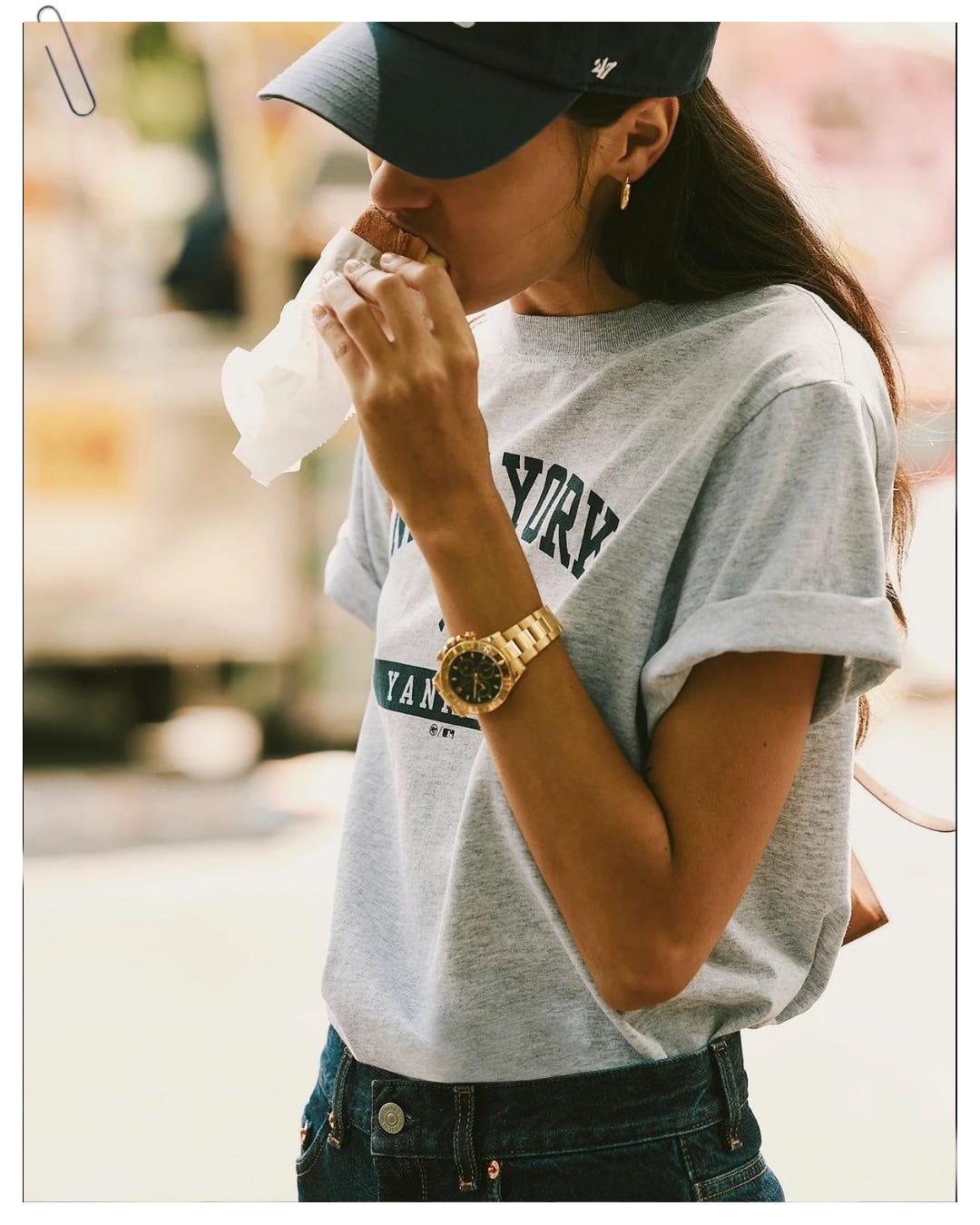 The thing I love most about an oversized, boxy t-shirt is it’s ability to shape shift. Rolling the sleeves gives you a hint of shape without making it look like you’re trying to give yourself shape. There’s nothing worse than looking like you’re trying to look skinny in something several sizes too big in the first place, you know? Just wear it oversized or don’t. Not everything needs to be figure flattering. This is my lukewarm hot take.