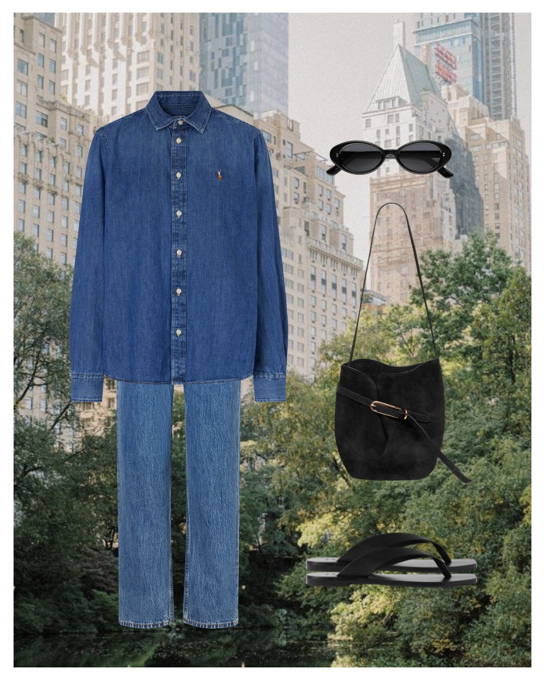 Button Down / Jeans / Bag / Flip Flops / Sunnies